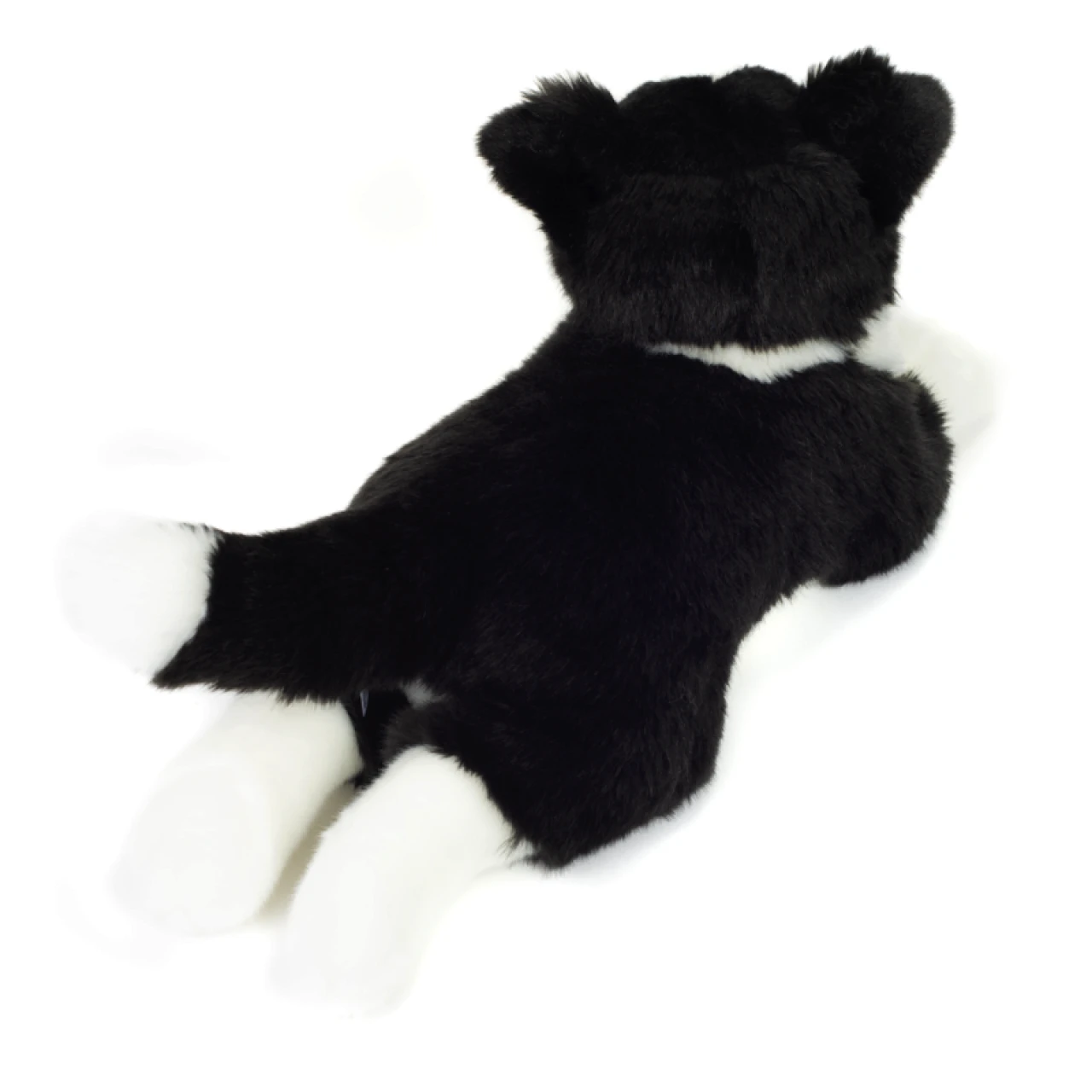 Quirlig, schlau und sehr neugierig – dieser Border Collie von Teddy Hermann ist ein echtes Energiebündel und zu jedem Abenteuer bereit. Gerade hat er alle Pfoten von sich gestreckt, doch sein wacher Blick verrät, dass er nur darauf wartet, mit seinen Spielgefährten durch das Kinderzimmer zu toben. Mit einer Größe von 45 cm lässt er sich hervorragend in den Arm nehmen. Sein schwarz-weißes Fell hat eine typische Musterung und ist darüber hinaus kuschelig weich. Die detailverliebte Gestaltung von Augen und Näschen zeugt von der liebevollen Handfertigung des Kuscheltiers.