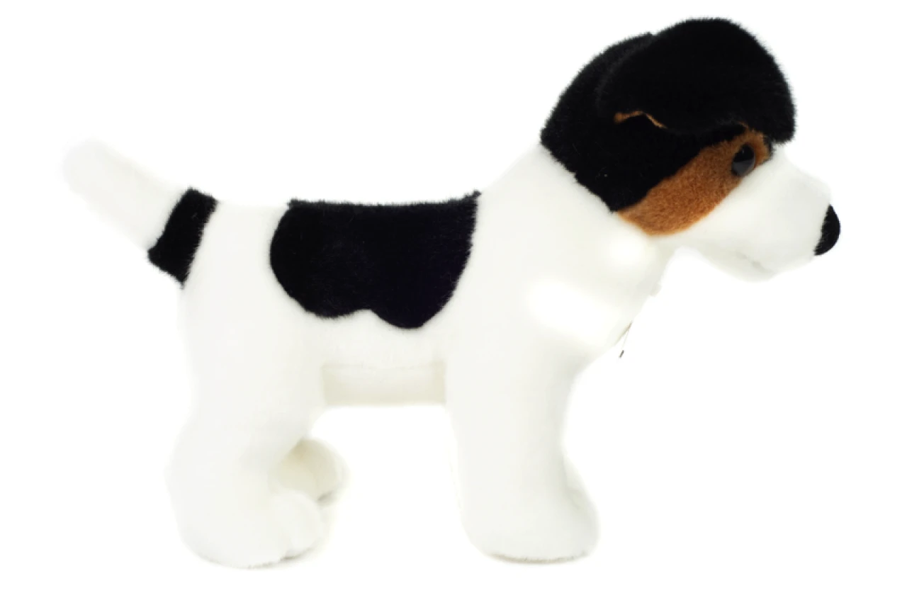 Kleine Hundewelpen ziehen neugierige Kinderaugen automatisch an. Vor allem der Jack Russel Terrier Welpe von Teddy Hermann ist ein absoluter Hingucker. Seine weiß, schwarz und braunen Farbdetails passen perfekt zu den schwarzen Knopfaugen. Der 28 cm große Hund schmiegt sich ideal in kuschelnde Kinderarme und ist ein großartiges Dekoration-Detail im Kinderzimmer.